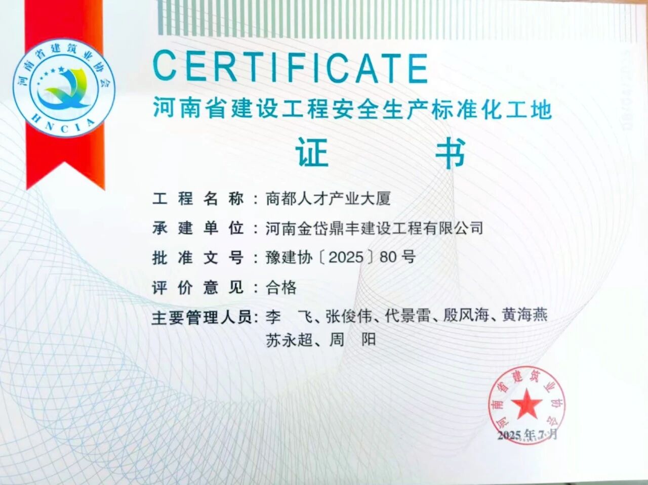 近日,河南省建筑業協會發布了《關于公布2025年度第一批河南省建設工程安全生產標準化工地名單的通知》,由公司監理的商都人才產業大廈項目榮獲“河南省建設工程安全生產標準化工地”稱號,標志著項目在安全生產、文明施工及標準化管理方面取得顯著成效,為鄭州市重點工程建設樹立了新標桿。