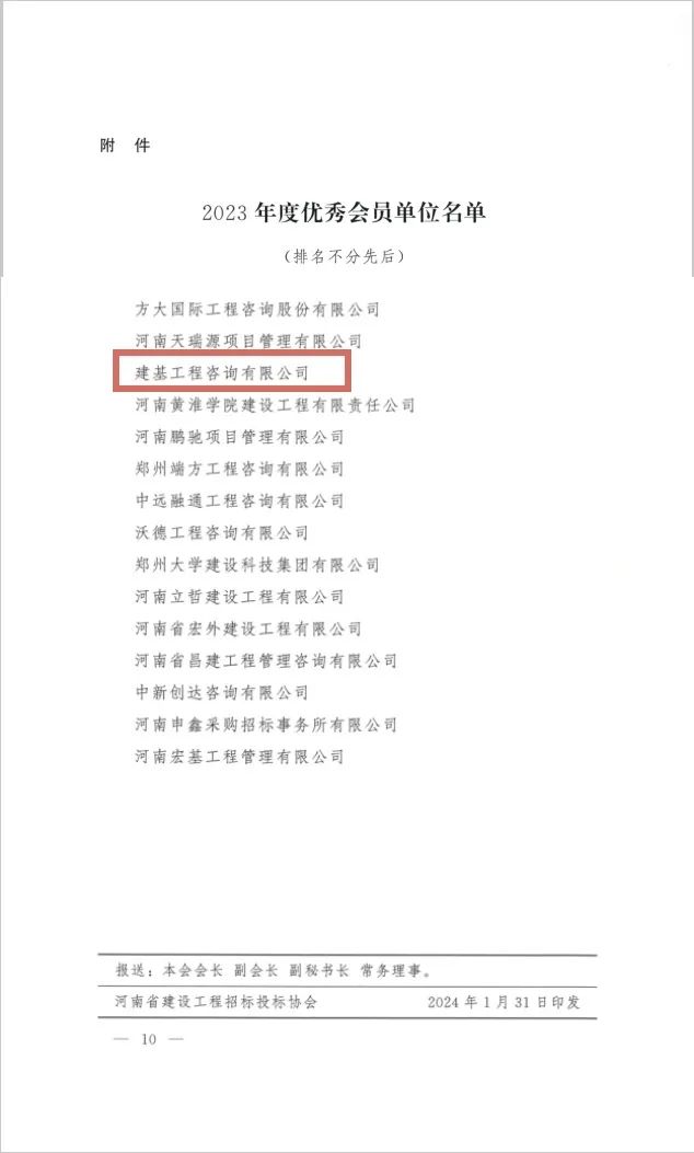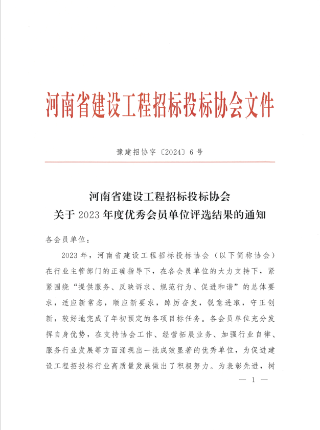 近日,河南省建設工程招標投標協會公布了“2023年度優秀會員單位評選結果的通知”,河南省招標投標協會公布了“關于表彰2023年度誠信自律建設先進單位、先進個人的決定”。