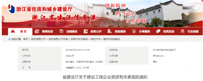 浙江省住建廳發布《省建設廳關于建設工程企業資質有關事宜的通知》,明確: