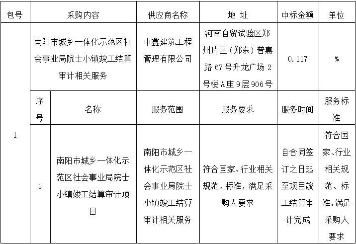 南陽(yáng)市城鄉(xiāng)一體化示范區(qū)社會(huì)事業(yè)局院士小鎮(zhèn)竣工結(jié)算審計(jì)項(xiàng)目成交公告